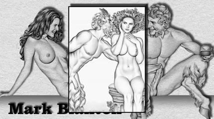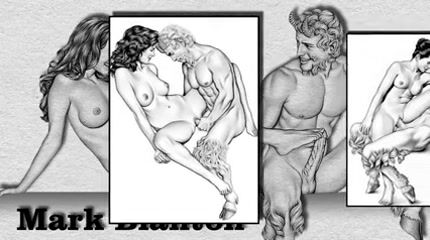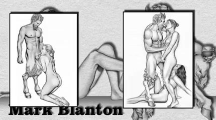The Amarican pin-up artist's Mark Blanton's pencil drawings show themes from the realm of Greek mythology with satyrs and nymphs during their imaginative and hilarious erotic games.