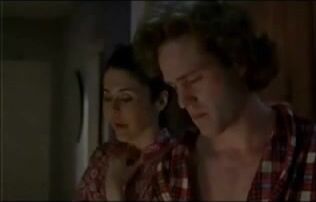 Maria Conchita Alonso topless having sex with some guy, while her left hard nipple is visible. From Caught.