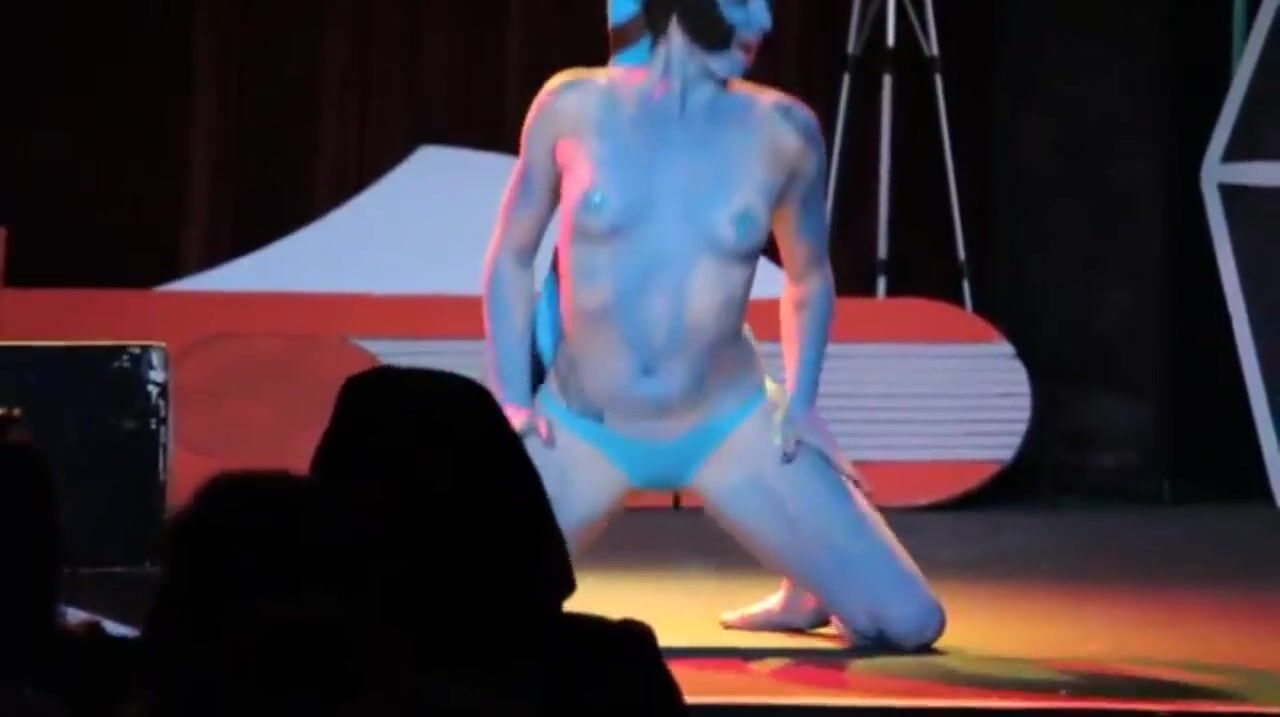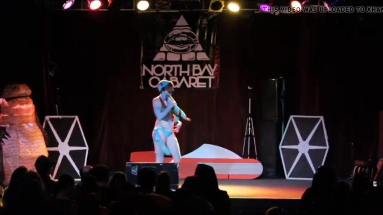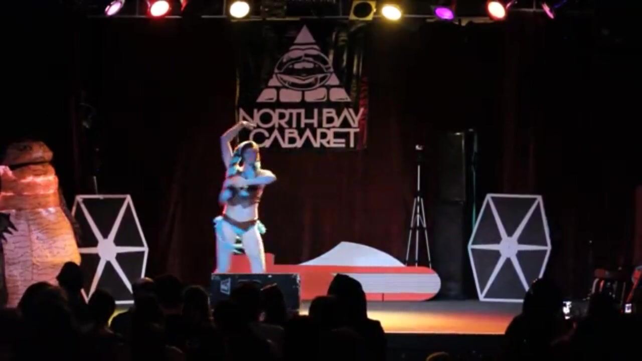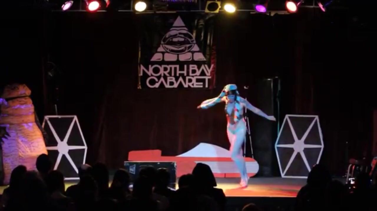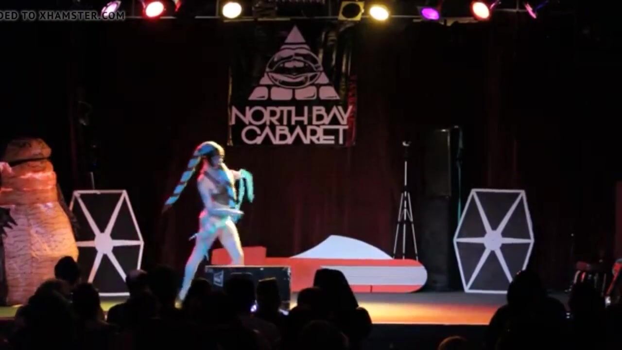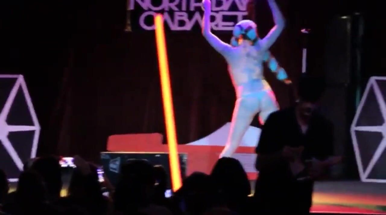A burlesque dancer made up like a Twi' Lek doing a strip tease with lightsabers at the end. It originally had no audio, so I threw in a song while editing. It is "That slippery little Hutt of mine".