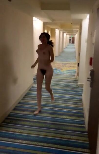 Latina secret exhibitionist does a dare by running naked thru the hallway. We can see a nice view of her tits bouncing and her massive hairy black bush