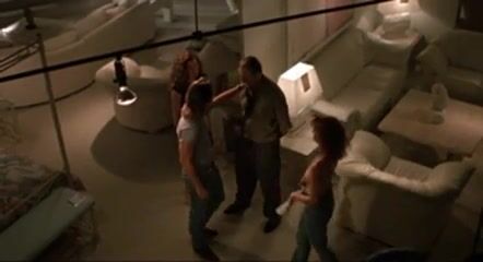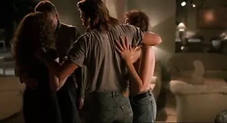 Mimi Rogers nude lying in the lap of Stephanie Menuez, her large left breast visible as a guy has sex with her. From The Rapture.