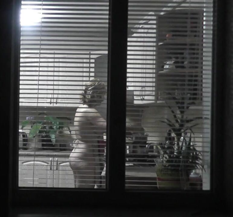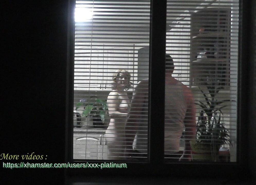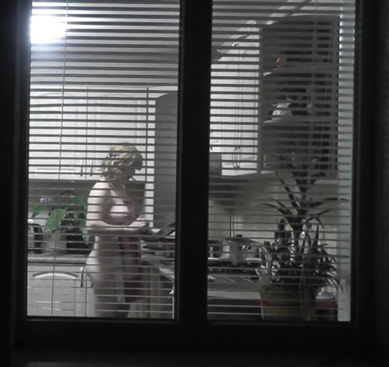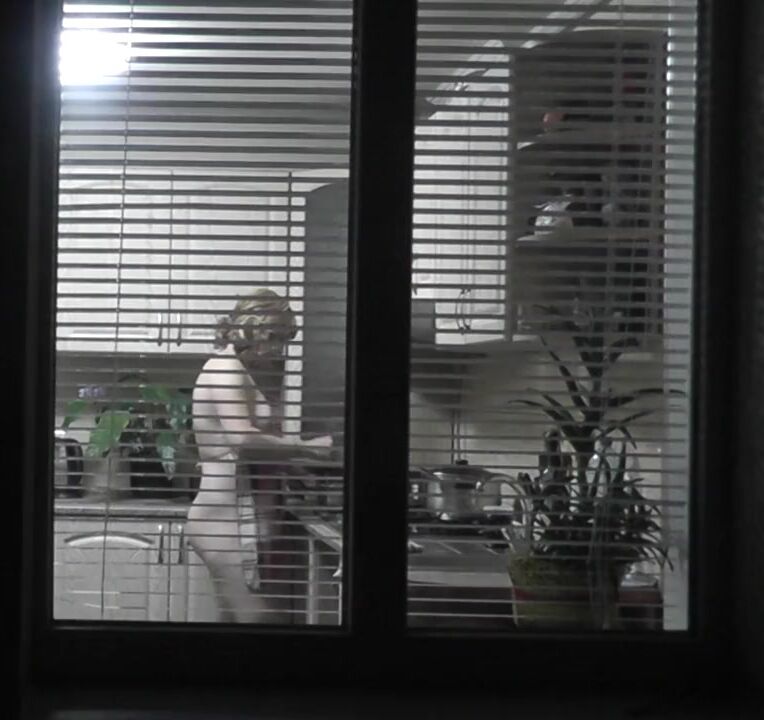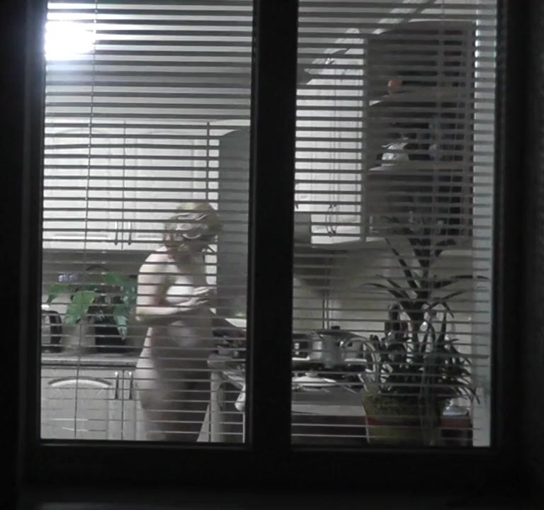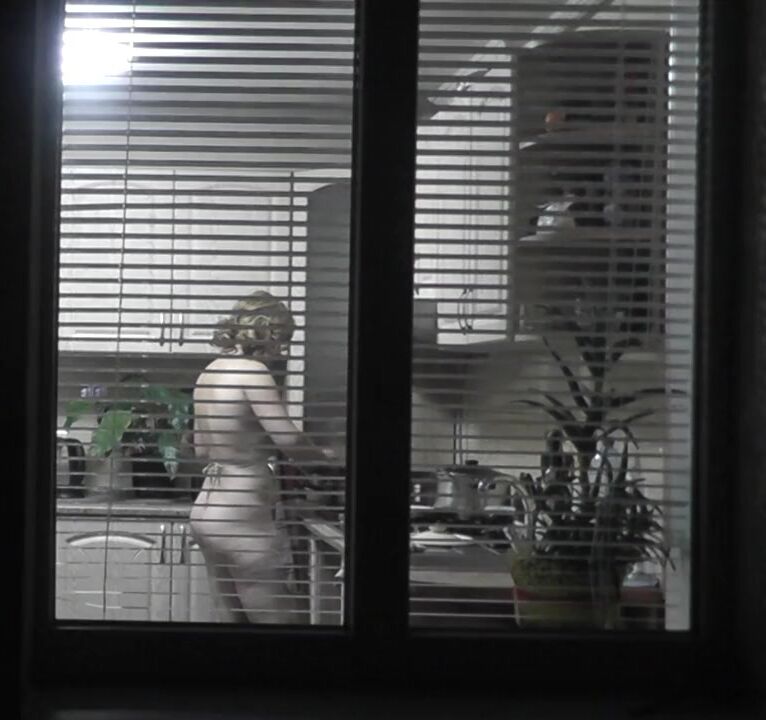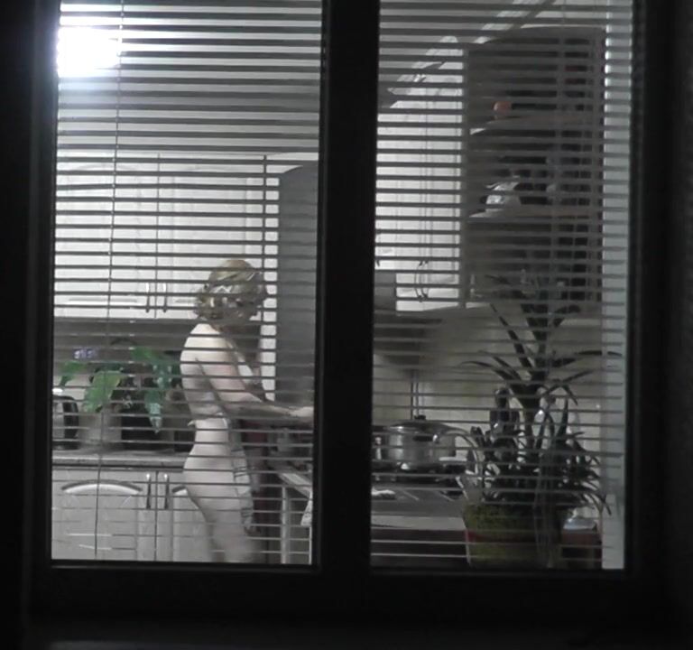 In kitchen. My wife came to visit my mother and is naked preparing dinner for for mommy's lover. Spy behind open window. Family nudism. Spy cam