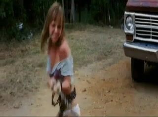 Christina Ricci wearing a pair of white panties and a cut-off shirt as a guy leads her through a field with a chain wrapped around her waist.