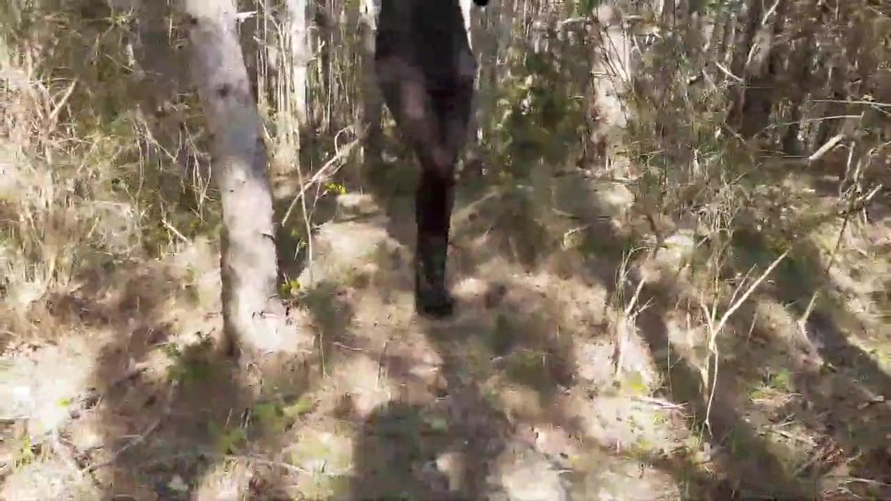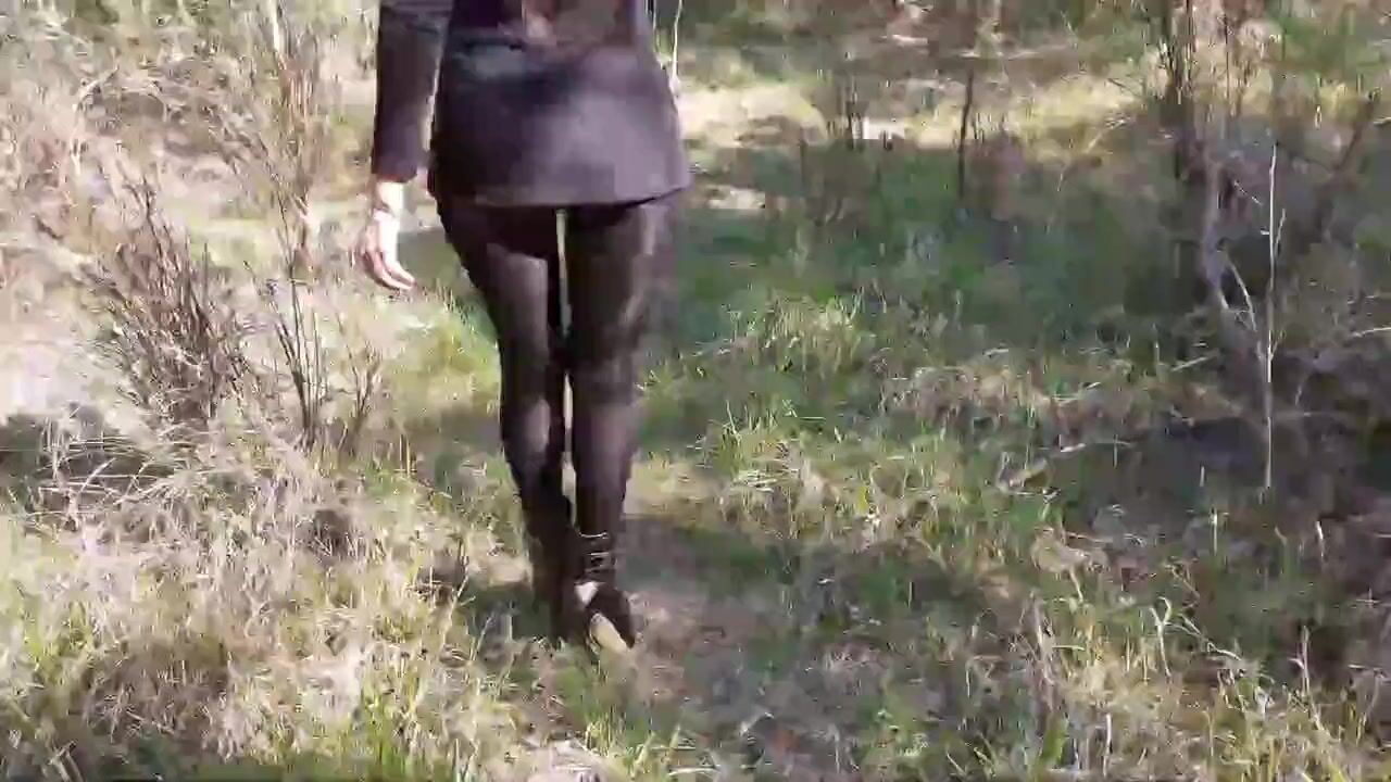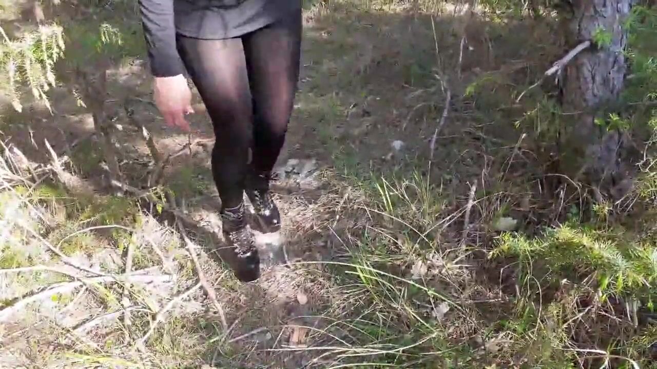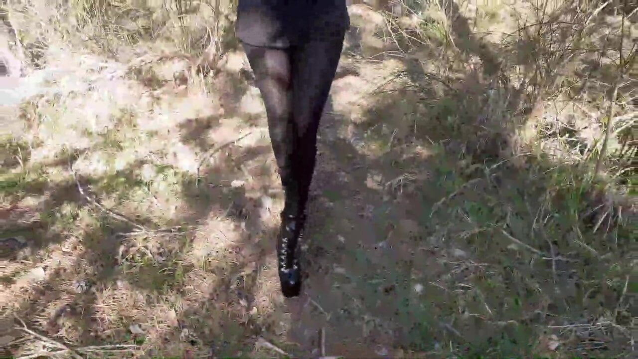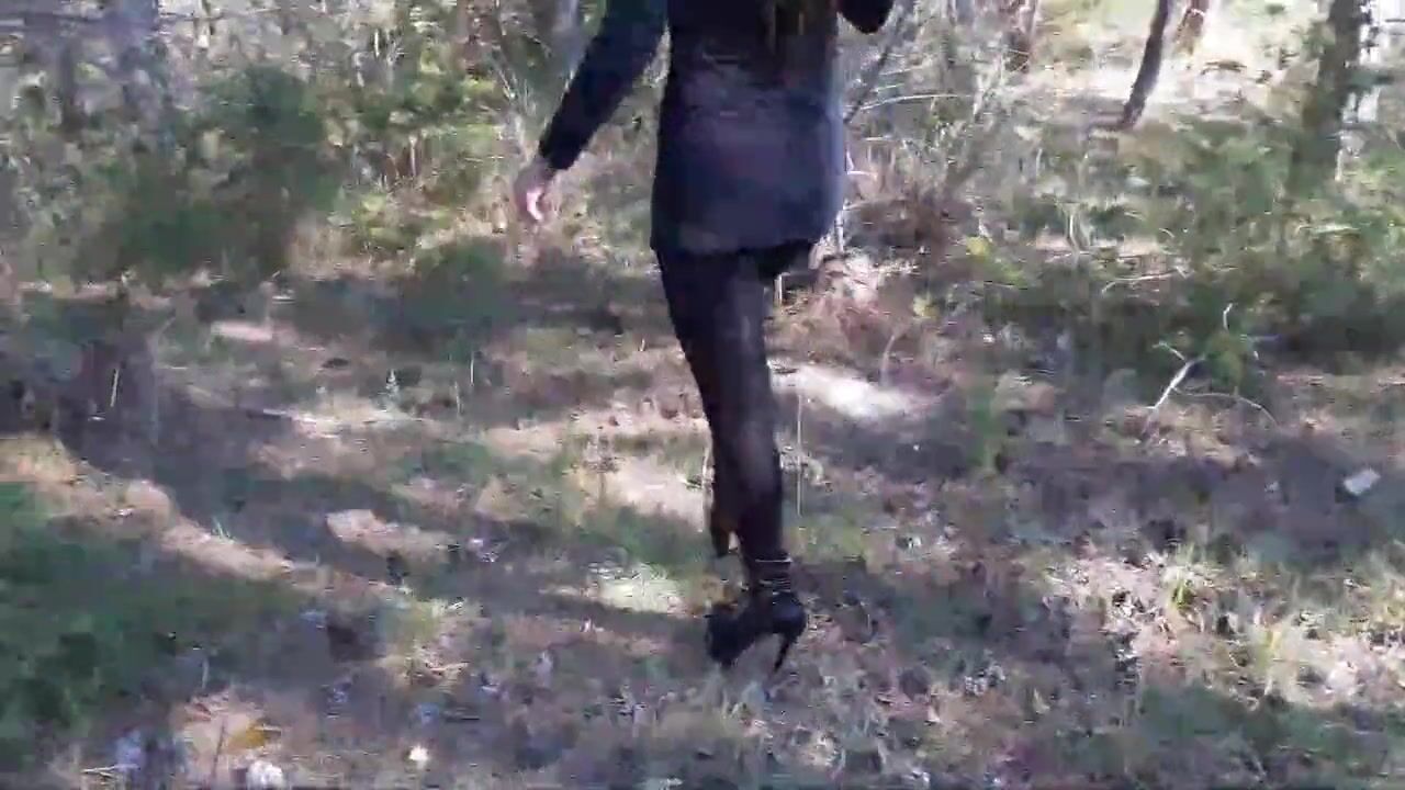 Laura on Heels model step sister in a difficult walk in the forest, wearing black platform heels. Walking on the wood wearing a black dress, pantyhose and high heels ankle boots
