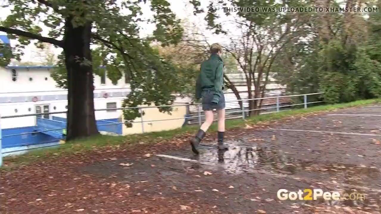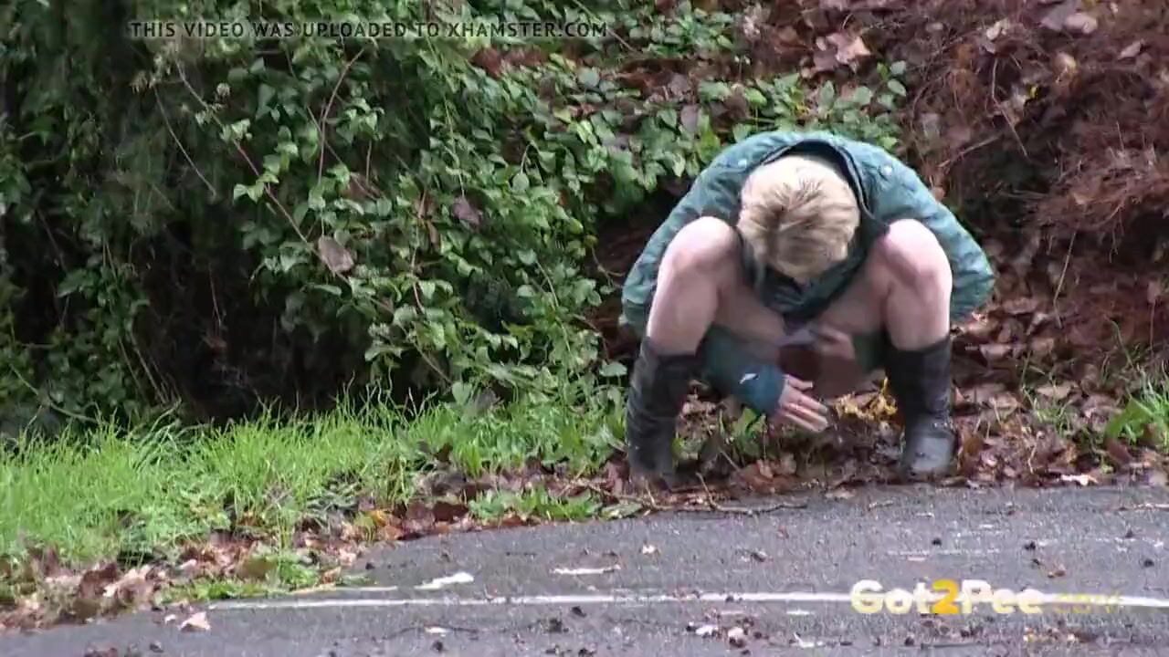 A cute blonde girl in a denim miniskirt is walking through a car park and needs to pee so she pulls down her panties and enjoys a public piss while we film her for Got2Pee