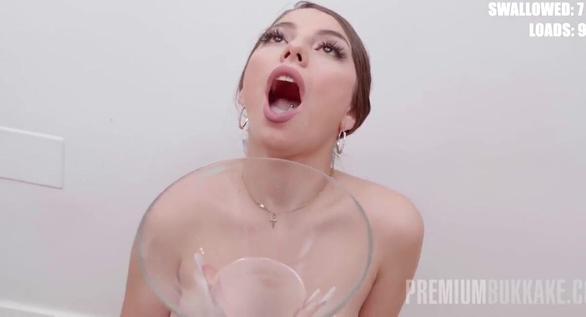 Adorable brunette gives a quick interview, poses in fancy white lingerie, gets to showcase her cum-swallowing skills in one of the wildest bukkake porn movies of 2021.