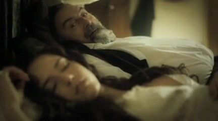 Ana Claudia Talancon lying on her back having sex with a guy while her breasts and nipples popping out a bit every now and then all as another guy spies on them. From Purgatory.