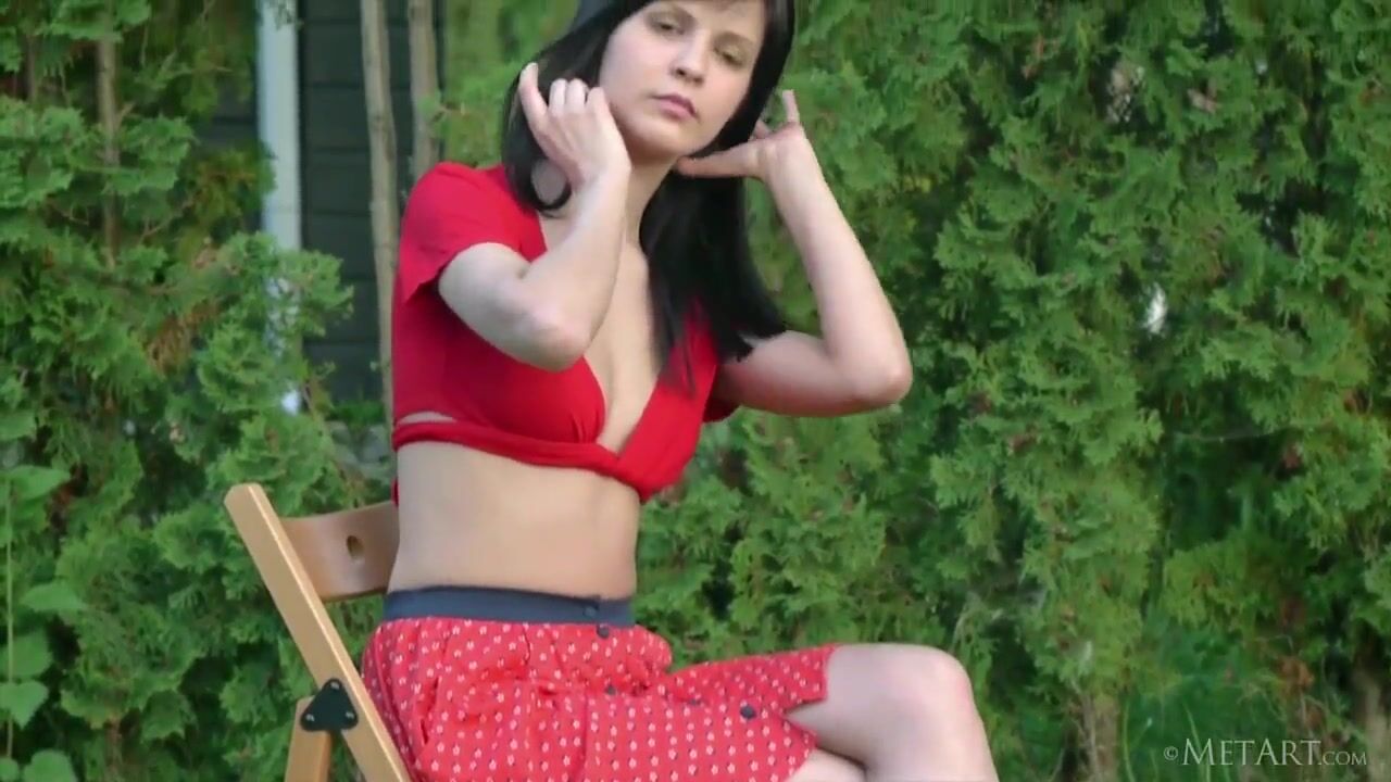 The dark haired babe can enjoy her body far better on a comfortable chair. She peels her top off her shoulders, her cute titties warming under the sun, and spreads her legs...