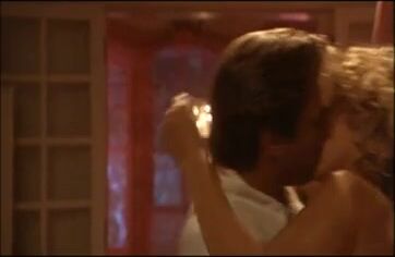 Virginia Madsen topless in a window as she pulls the curtain aside and looks out. She is then seen in a sexy bustier as she reclines in bed and a guy enters the room. From The Hot Spot.