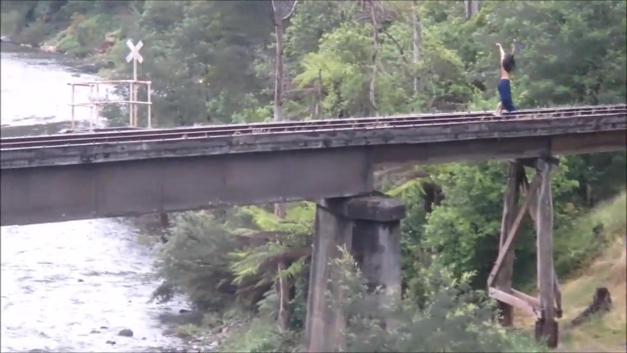 Dancing on top of a car and through the train tracks on a bridge