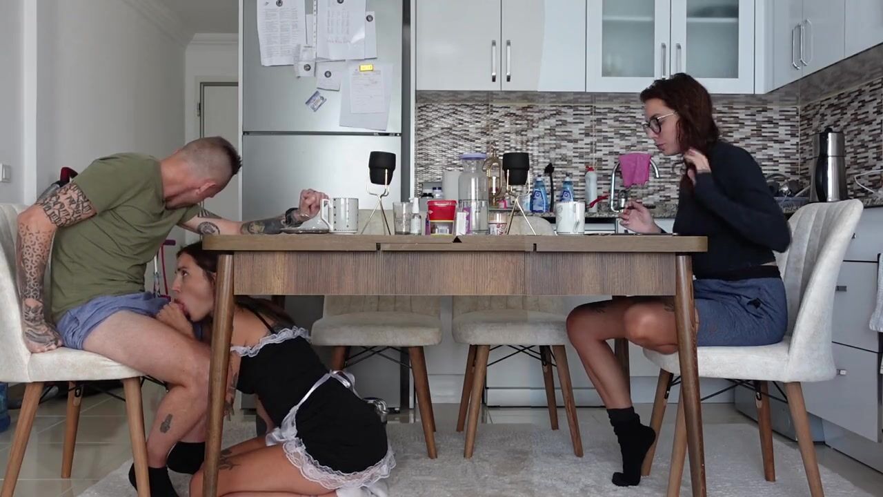 my maid is a very hot whore and I often fuck her when my wife is not at home. But then she went crazy and started sucking me in front of my wife under the table... how it all ended can be seen in the