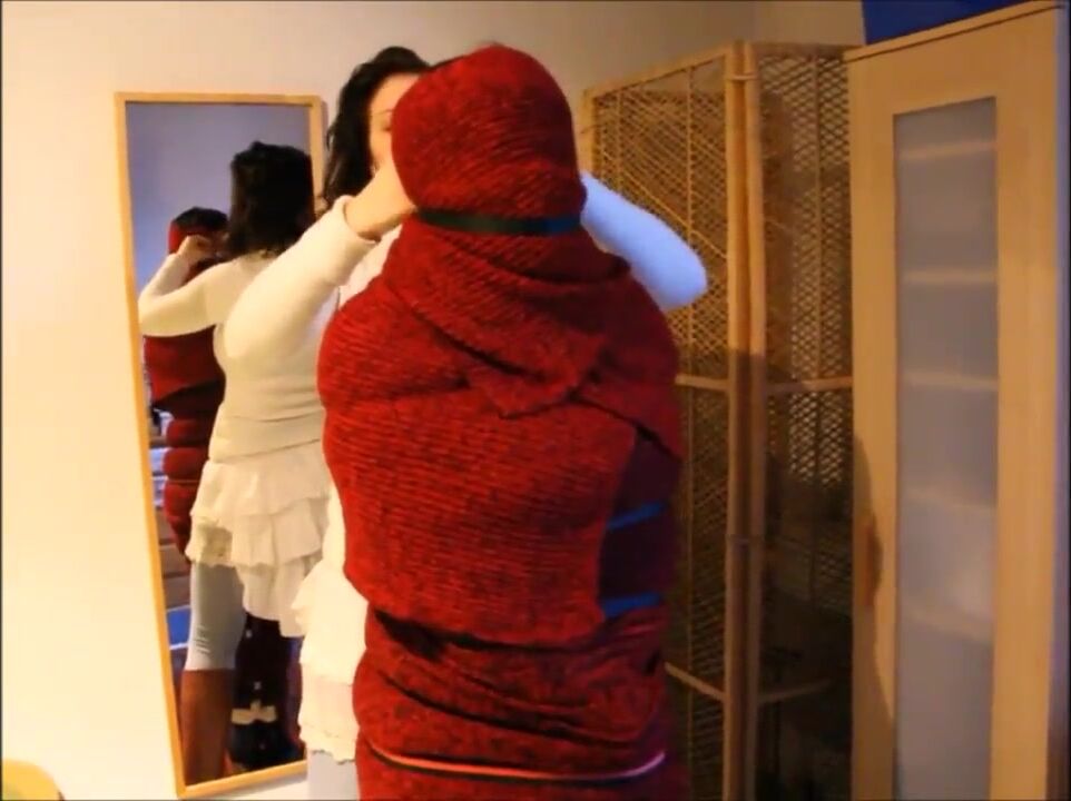 Mummified in wool with encasement underneath her clothes, she is caressed and cuddled by her captor. I'd love to be taken and bound this way by a woman one day.
