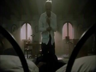 Anna Galiena topless pulling her big breasts out of her dress and rubbing her nipples as she riding a guy in bed during very hot sex action. From Senso.