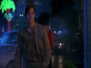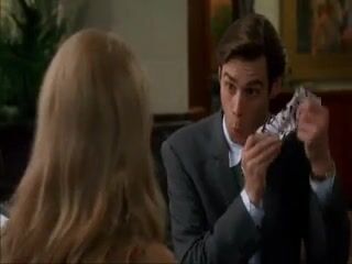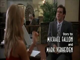 Cameron Diaz showing some wonderful cleavage in a body-hugging red dress as she comes in out of the rain and sits down to talk to a guy at a bank.