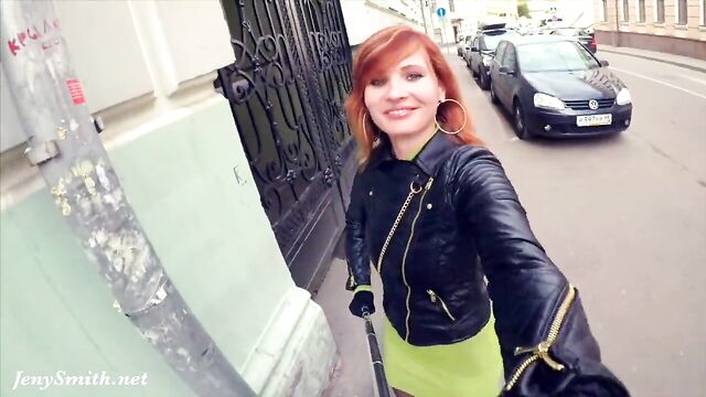 Jeny Smith gets naked on the streets and on the road. Finally she leaves only stockings and shoes on her!