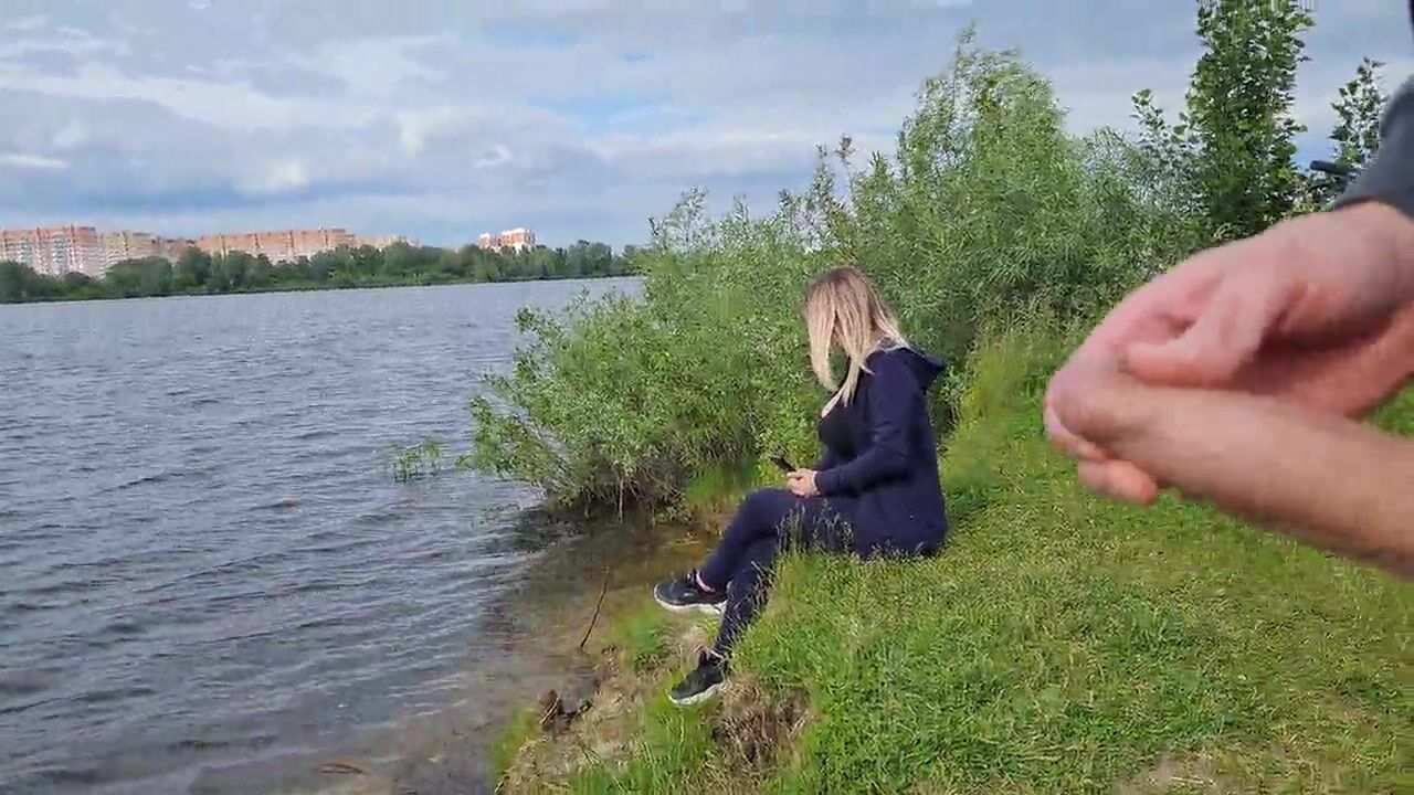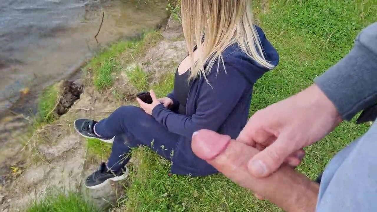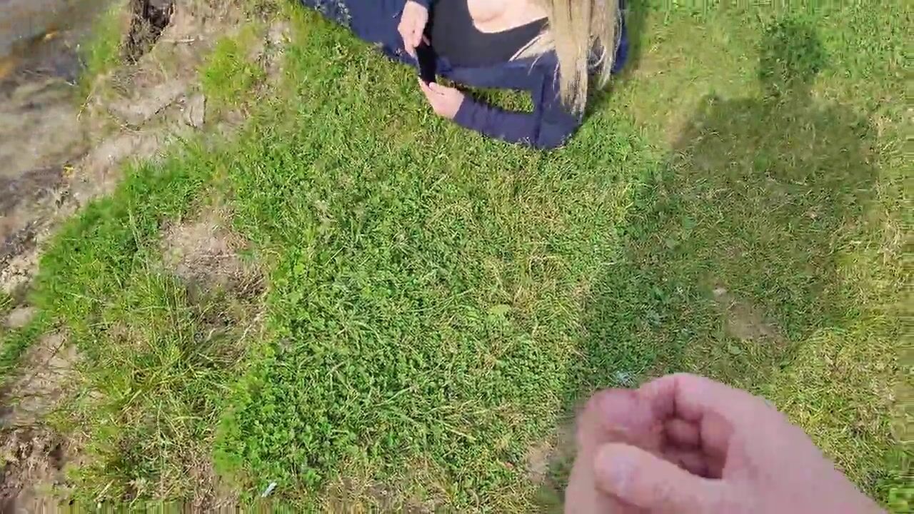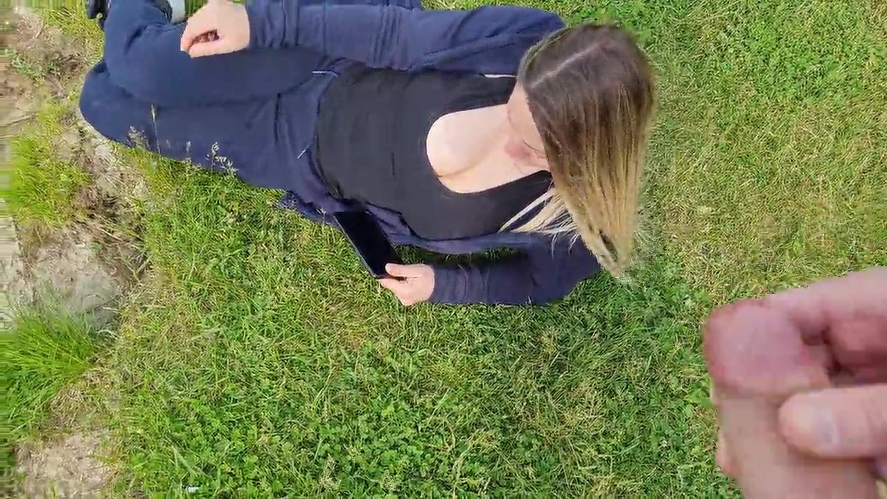 Man Public Flash Cock and cumshot near blone girl with big natural tits on nature
