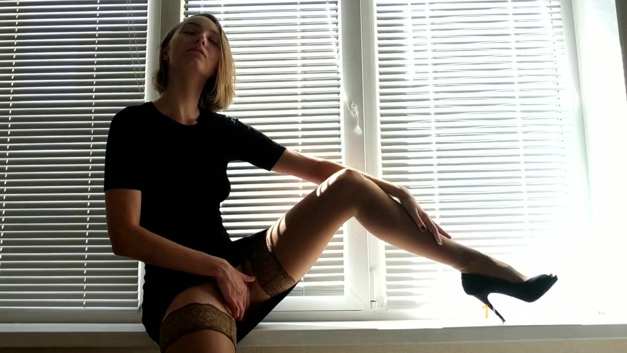 Short hair girl in black dress, stockings and high heels masturbates sitting on the windowsill. In addition, the clip contains pussy licking and fucking in doggystyle + cum on girl's ass in the end!