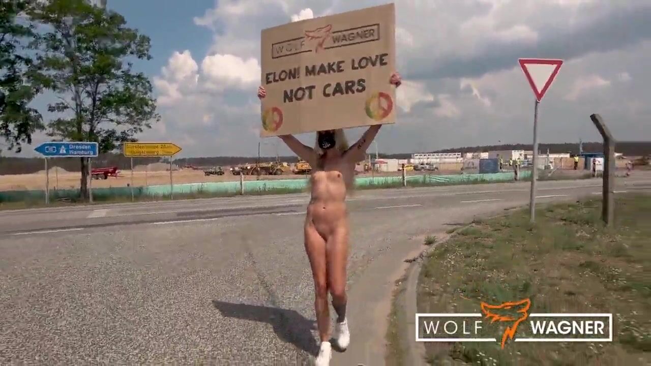 Completely naked and only with a sign „Elon! Make love not cars“ Kitty walks along the street to protest the waste of water in Tesla's production. Then she fucks Andy Star outdoors! wolfwagner.com