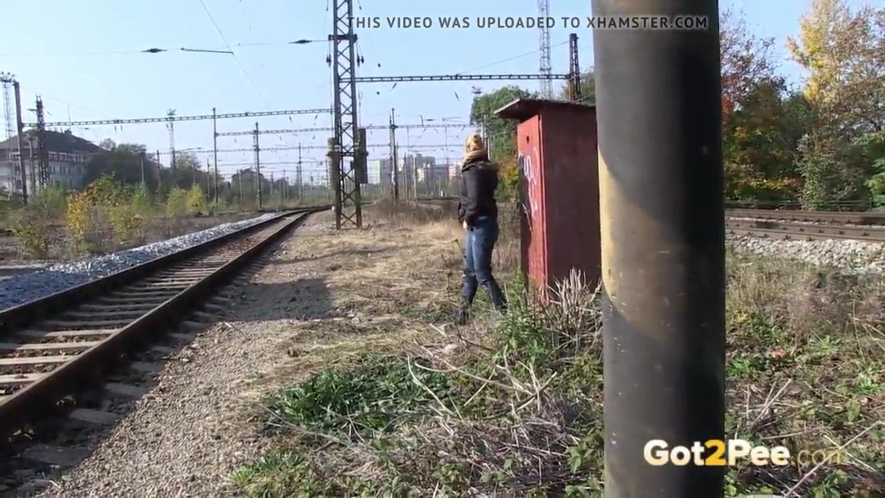 A European blonde girl is walking alongside the train tracks and really needs to pee but can't find anywhere to go so she pisses outside in the wind but gets soaked in her juices!