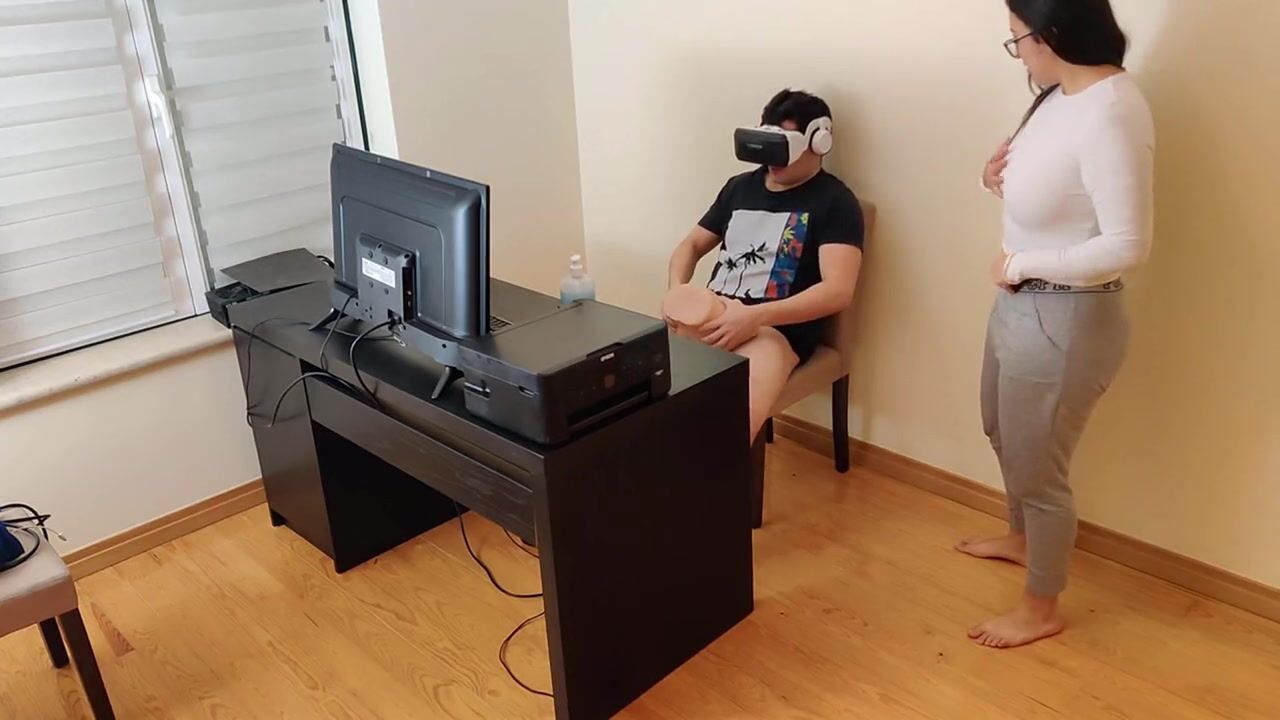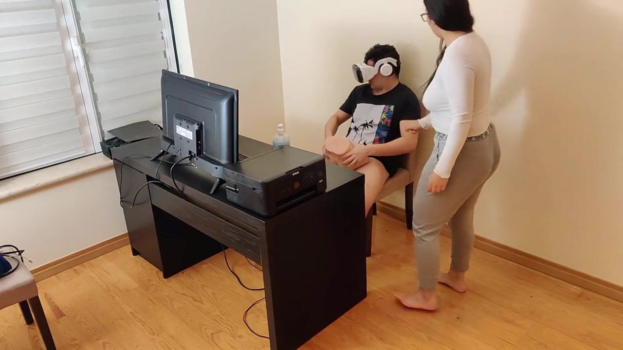 Hot mother masturbates next to her son's friend while he watches porn with virtual reality glasses
