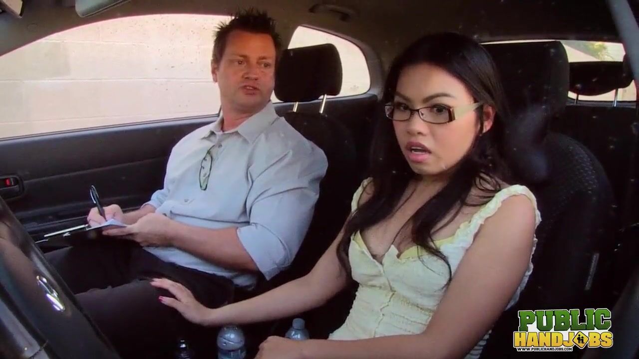 Asian teen is about to fail her drivers' test, so like a good girl, she pulls over and strokes his cock