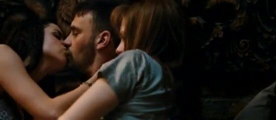 Anna Faris and Rose Byrne in their hot lingerie making out with some guy on the bed in this hot threesome sex action. From I Give It a Year.