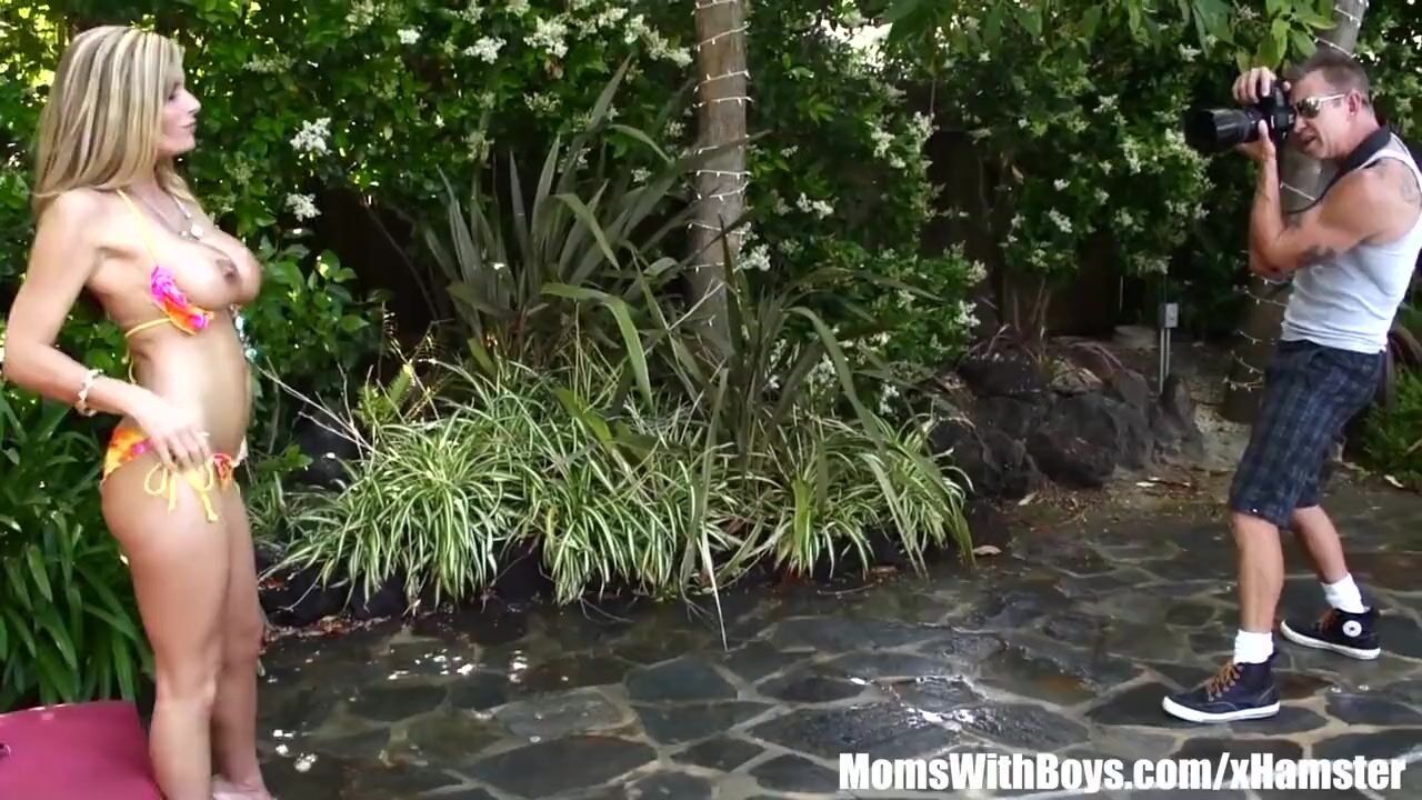 Busty mature in her sexy bikini oiled-up for a photoshoot and gets fucked on set receiving a creampie.