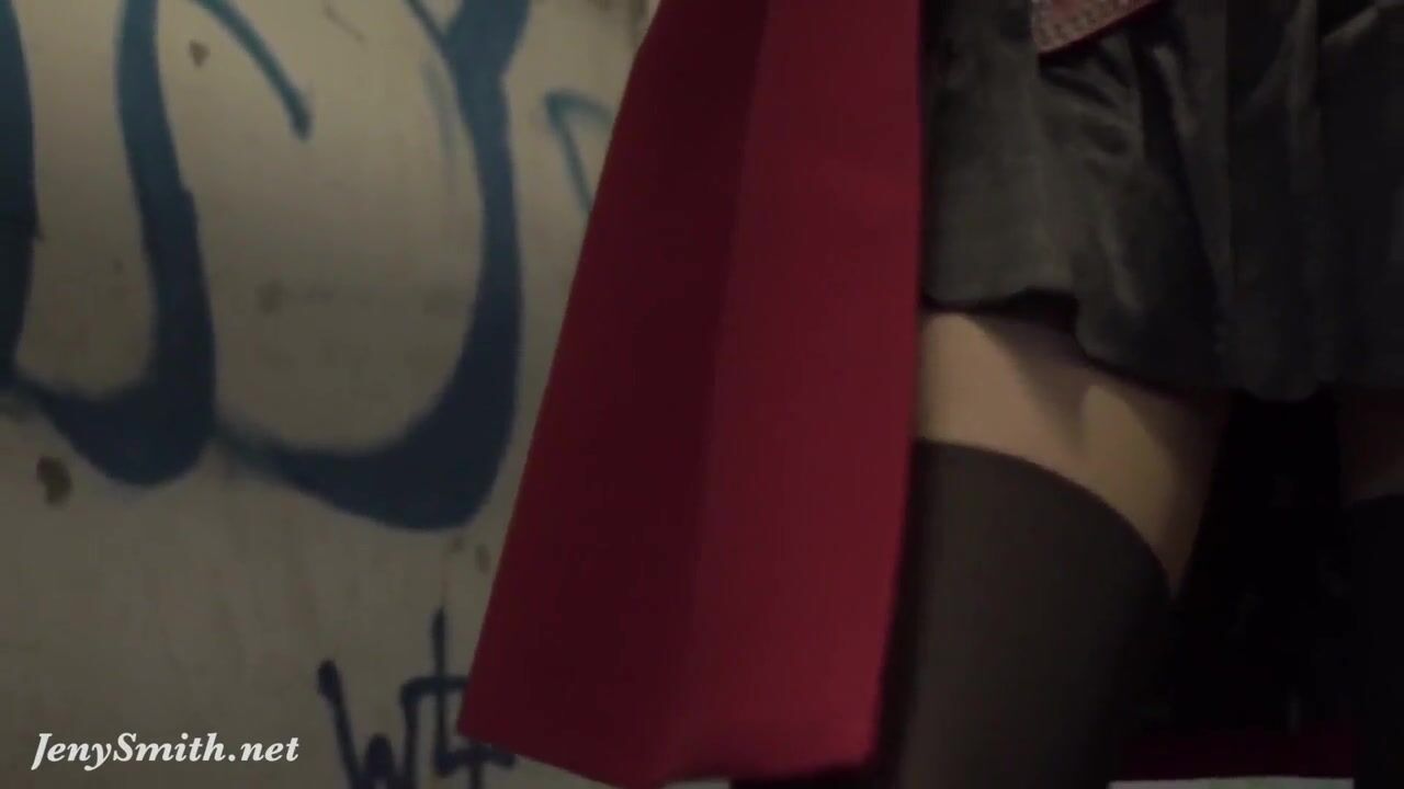 Jeny Smith dressed as a rock star flashes her pantyhose in a public place
