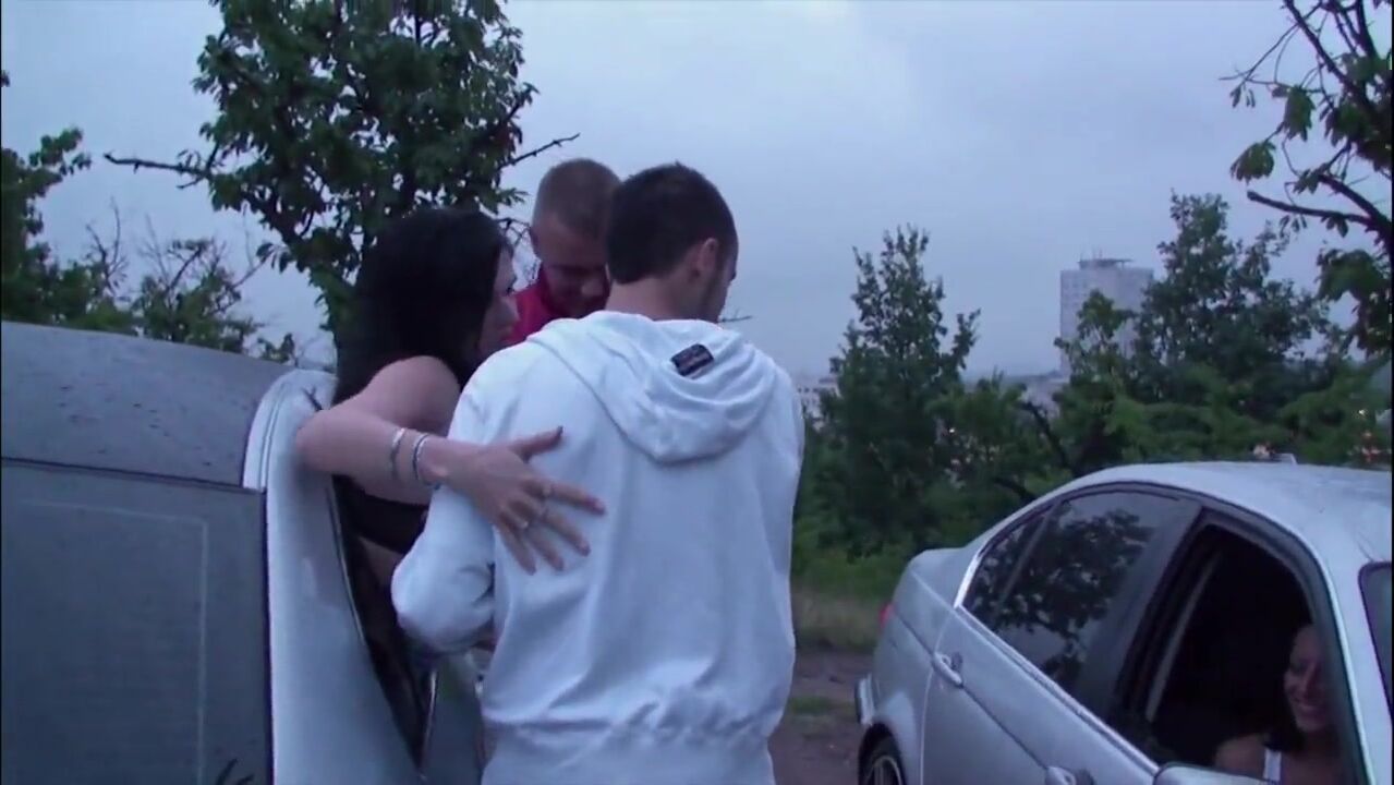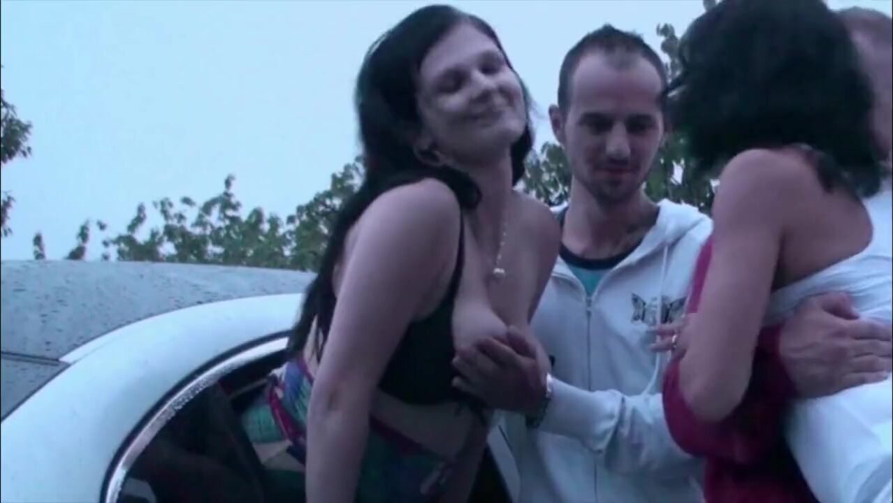 2 guys with big dicks fuck 2 girls with wet pussies in public through a car window with blowjobs and doggy style sex