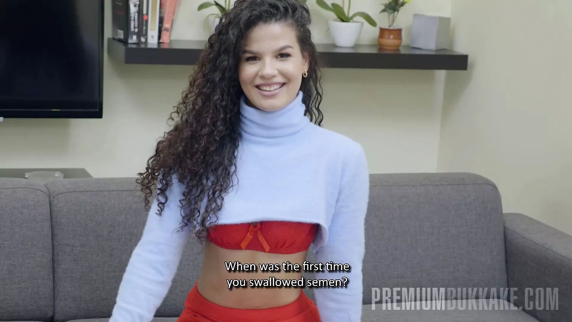 Hot babe enjoying herself in a wild bukkake XXX movie. The good-looking first-timer with frizzy hair worships cocks and swallows semen a lot.