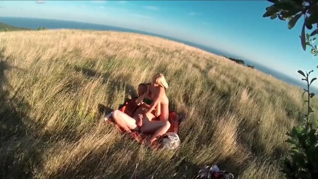 Nude couple fucks in a field