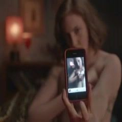 Lena Dunham pulling her shirt over her head to go topless as she holds her phone out in front of her and snaps a picture of herself with the camera. From Girls.
