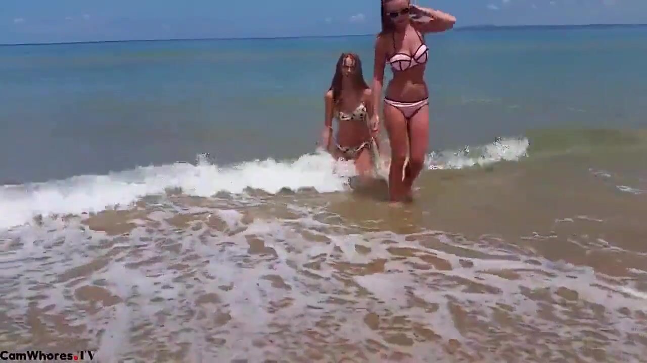 Two non-twins , but close, frolic at the beach.