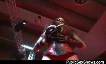 Gorgeous ebony stripper takes off sexy corset and shows huge natural breasts