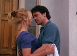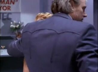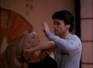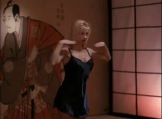 Cynthia Rothrock kissing a guy while on the floor near a fireplace, and then having him remove her black bra to briefly expose her right breast as she embraces him. From Sworn to Justice.
