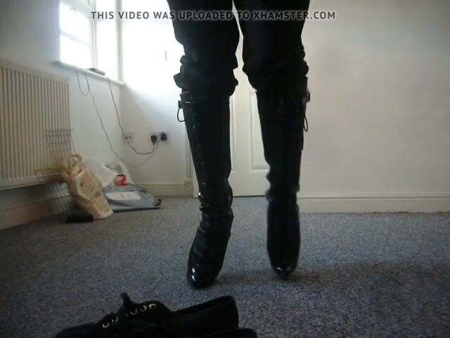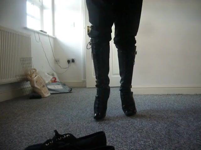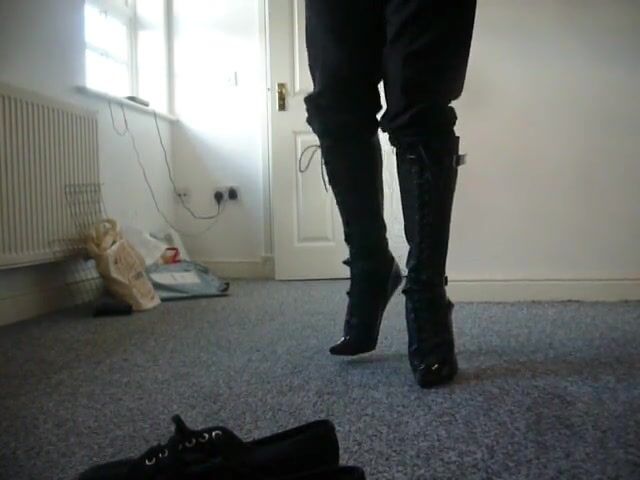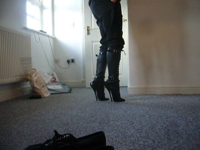 Walking and standing in knee length ballet boots with pointed toe. Do not be decieved by the pointed toe, it is for show only, these are truly ballet style heels, the toe cap helps with balance.