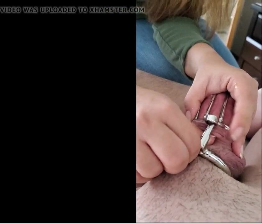 Hubby Caught Wanking Over Porn. Young hotwife installs new tight Chastity cage