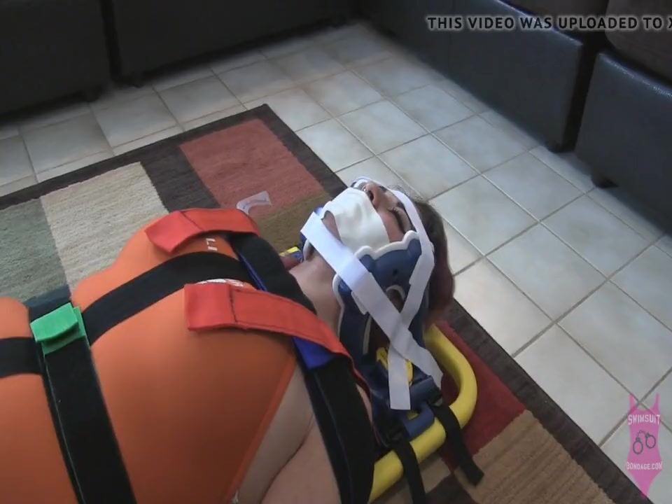 lifeguards in bondage wearing one piece spandex swimsuits. helpless bound and gagged struggling against the medical bondage. tape gags and ball gags.