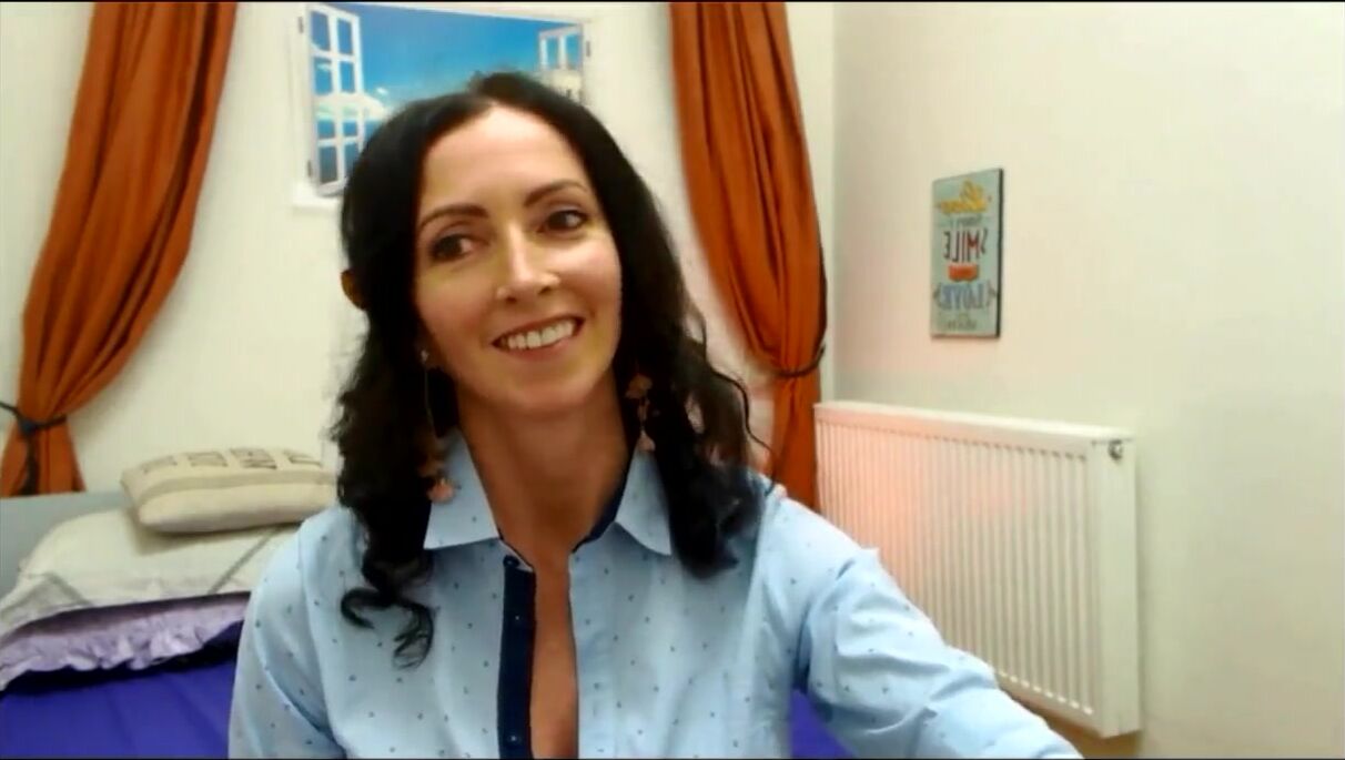 A mature European brunette flashes her firm boobs.