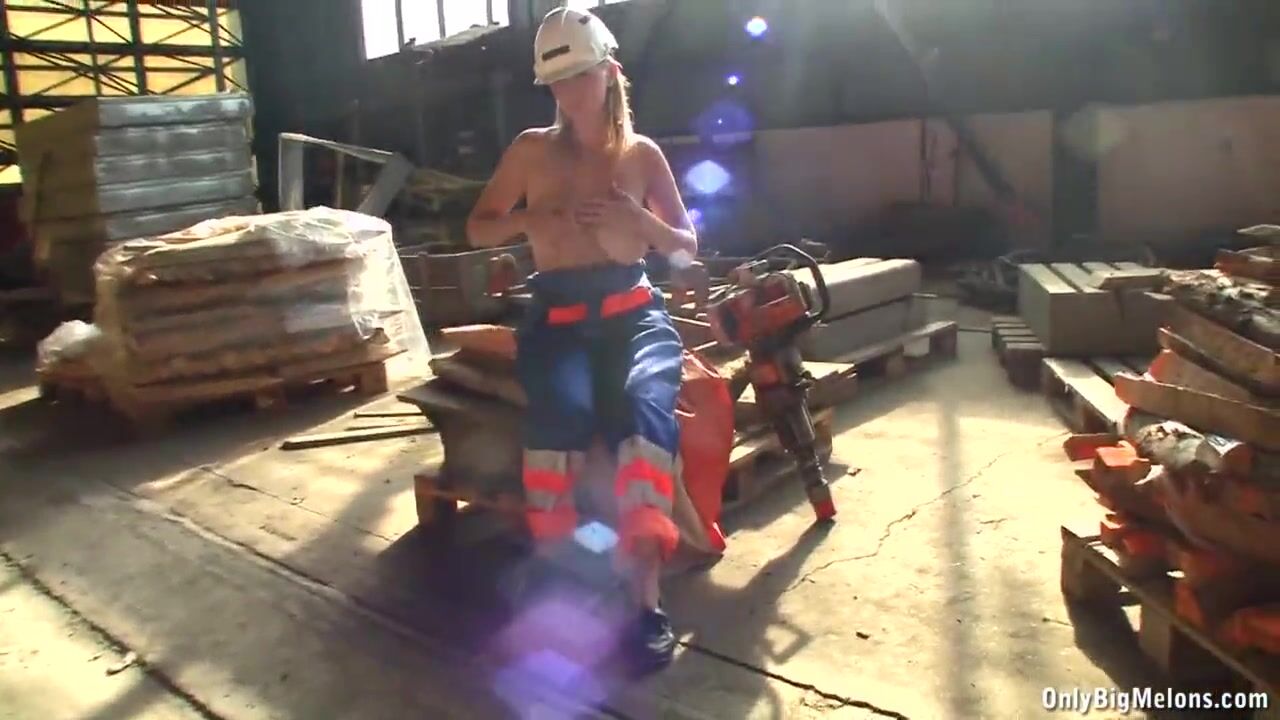 Czech blonde chick Shelby Moon playing with her massive natural tits at work