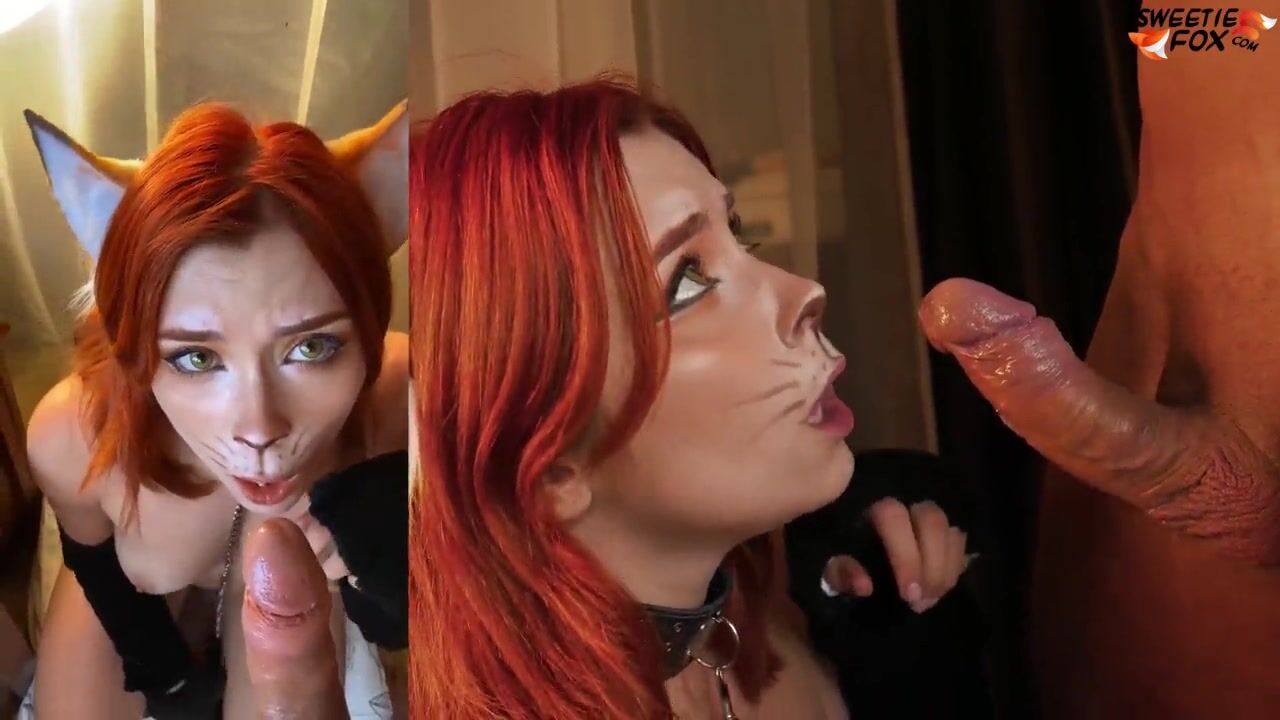 Cute fox sucks a huge dick and plays with a dildo - cum on face and mouth