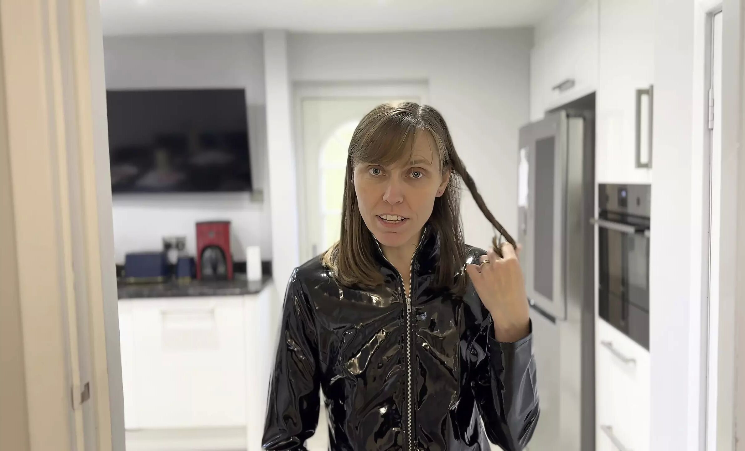 New Hot Neighbor keeps entering in a black PVC mini skirt. Determined to get what she wants, she even climbs through the window. But, she is just too irresistible, and get what she wants in the end,