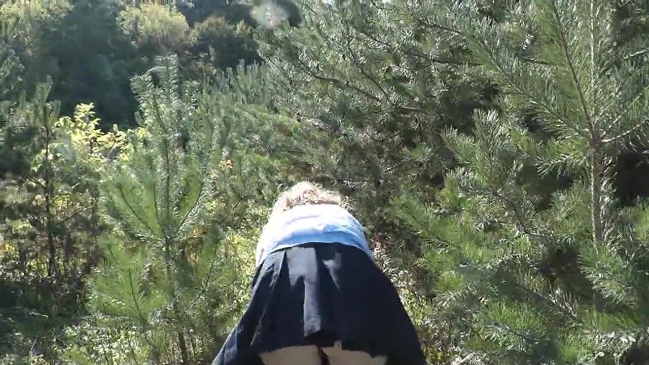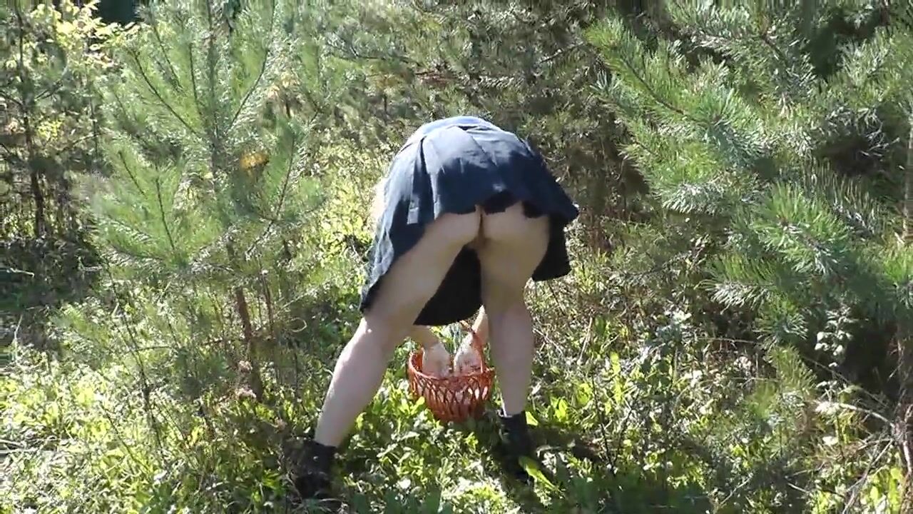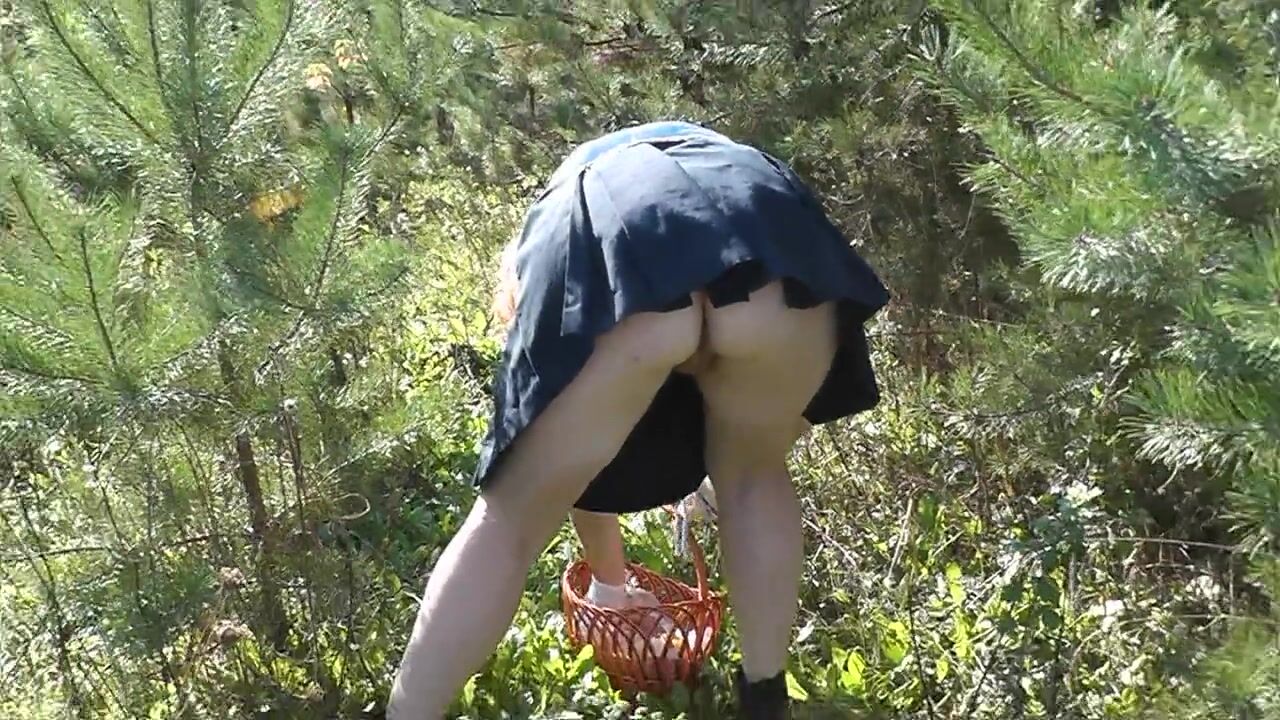 No panties under skirt. Sexy blonde MILF came to forest to pick mushrooms and forgot to wear panties. Public nudity.