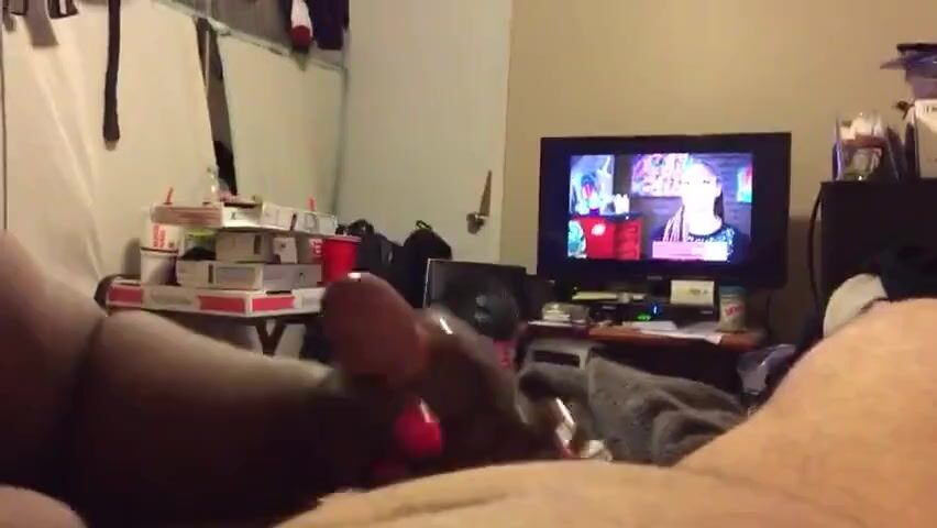 While watching TV, she milks her hubby with her long pink fingernails. He obviously enjoys it and shoots a huge load of cum within one and a half minute.