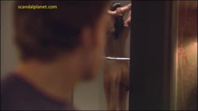 Jaime Murray of Spartacus fame exposes her beautiful body in a nude scene under the shower. She takes off her black bra and thong panties and we see her nude butt and boobs as she showering.