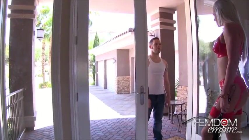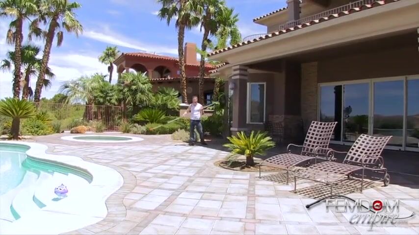 Gigi lures her pool boy inside to take a look at her massive strap-on cock, she orders him on his knees and makes him take every inch if he wants to be paid - FemdomEmpire.com