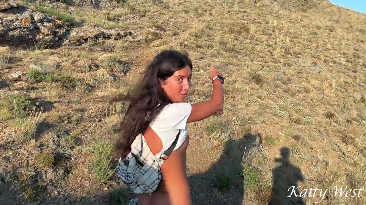 Beauty with a nice ass climbs the mountains to masturbate