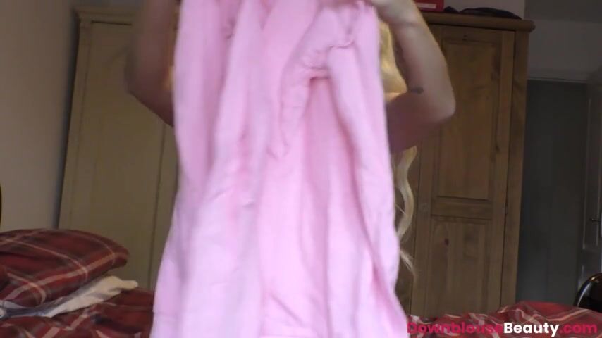 Stunning blonde babe called Lycia with big boobs shows off her downbloue beauty while she is talking with her friend