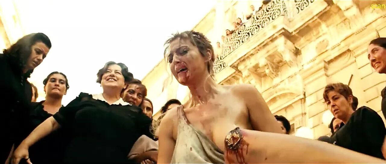 Monica is tousling from angry women and they tore her clothes and this sexy scene gives us a good look at her naked tits and hairy bush.