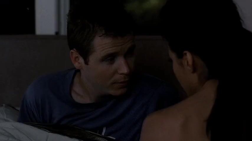 Emmanuelle Chriqui standing in a bedroom with a guy as she drops her red dress giving us a look at the side of her left breast. From Entourage.